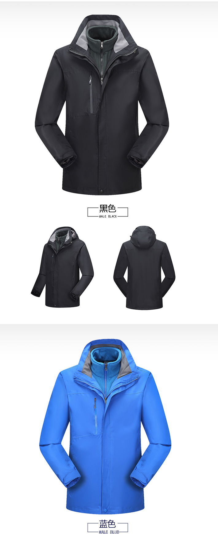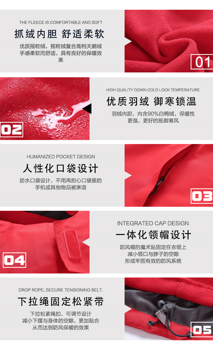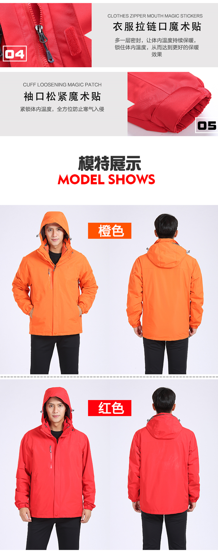 生產工藝:采用拉鏈壓膠防水工衣,可拆卸內膽、袖口松緊魔術貼