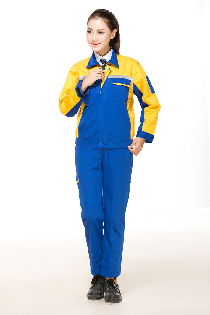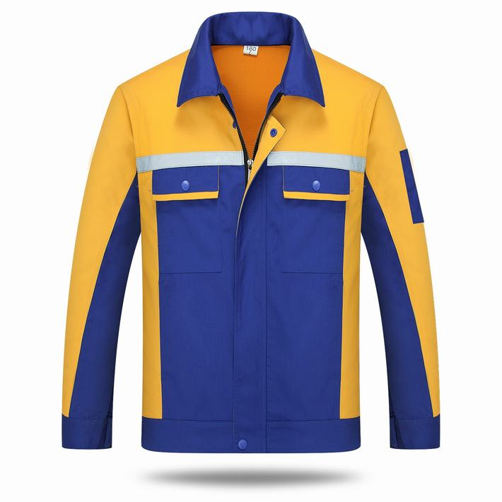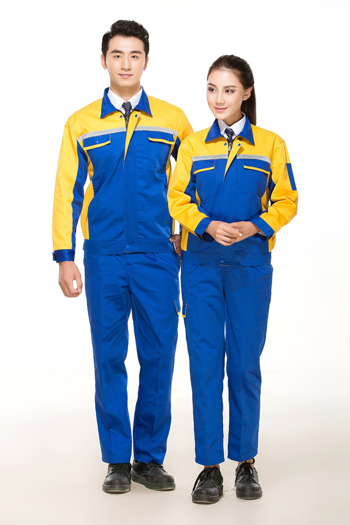 滌棉藍(lán)色拼黃色反光條工作服長(zhǎng)袖套裝GZ-DM8014